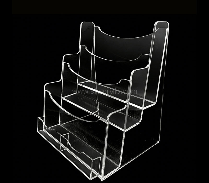This custom acrylic 3 literature holder with card holder is ideal for displaying brochures, flyers, and business cards together. Made from durable, clear acrylic, it offers a clean, professional look. Perfect for counters and reception areas. Sizes, pocket layouts, colors, and logo printing can be customized.
