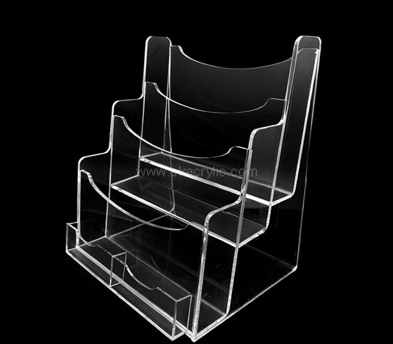 Custom acrylic 3 tiers pamphlet holder with built-in card holder for organized and eye-catching display. Crafted from durable, crystal-clear acrylic, it features stepped tiers for easy visibility and access. The front card slot is perfect for business cards or contact information. Ideal for offices, trade shows, retail stores, clinics, and reception areas. Custom sizes and branding available.