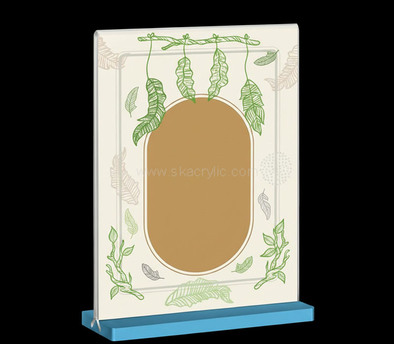 Custom acrylic double-sided sign holder with a vibrant blue base, designed for clear and professional display on countertops or reception desks. Made from high-quality transparent acrylic, it ensures excellent visibility from both sides while providing stable support and a sleek, modern appearance.