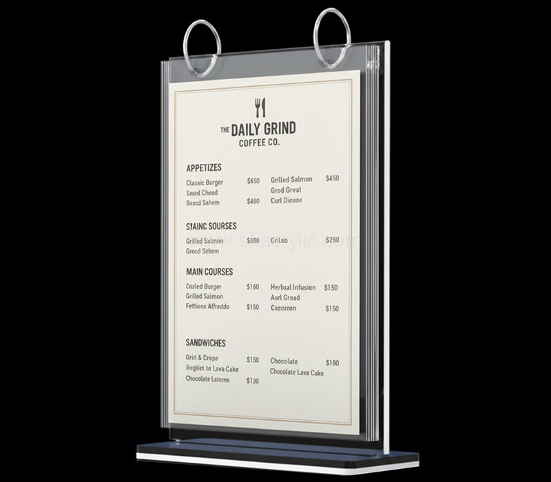 Custom acrylic flip menu stand made from premium clear acrylic for durability and easy viewing. Perfect for cafes, restaurants, and retail counters to display menus, product info, or promotions. Features a convenient flip design for quick updates. All-in door delivery included with no hidden fees or extra charges.