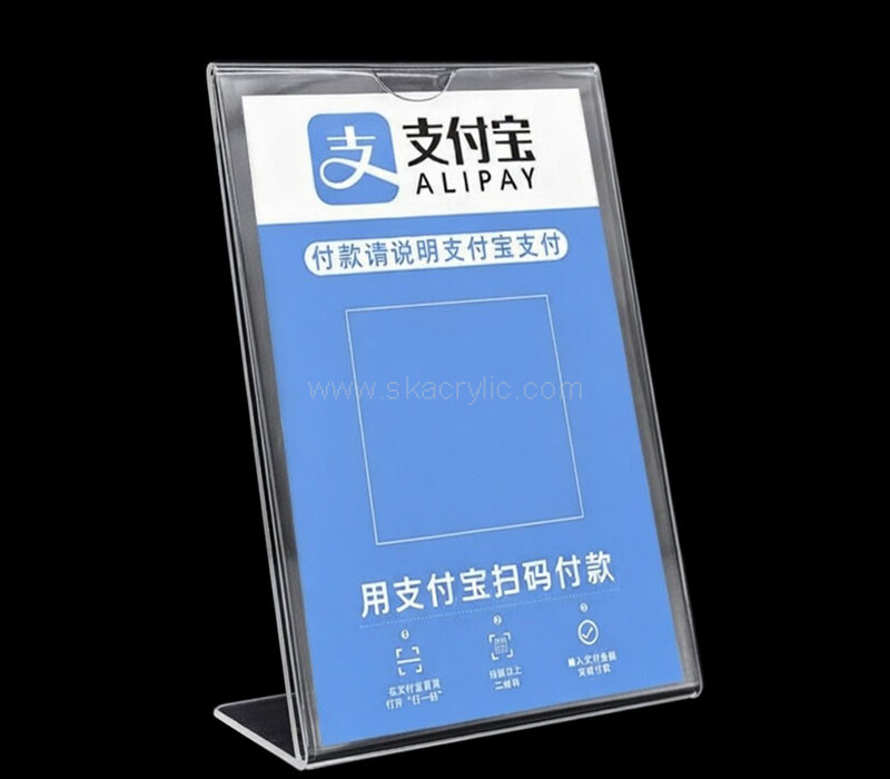 Custom acrylic L-shape payment sign holder, ideal for displaying payment instructions, notices, or promotional messages. Made from high-quality, durable acrylic, it provides a sleek, professional look while keeping signs visible and accessible on counters or desks.