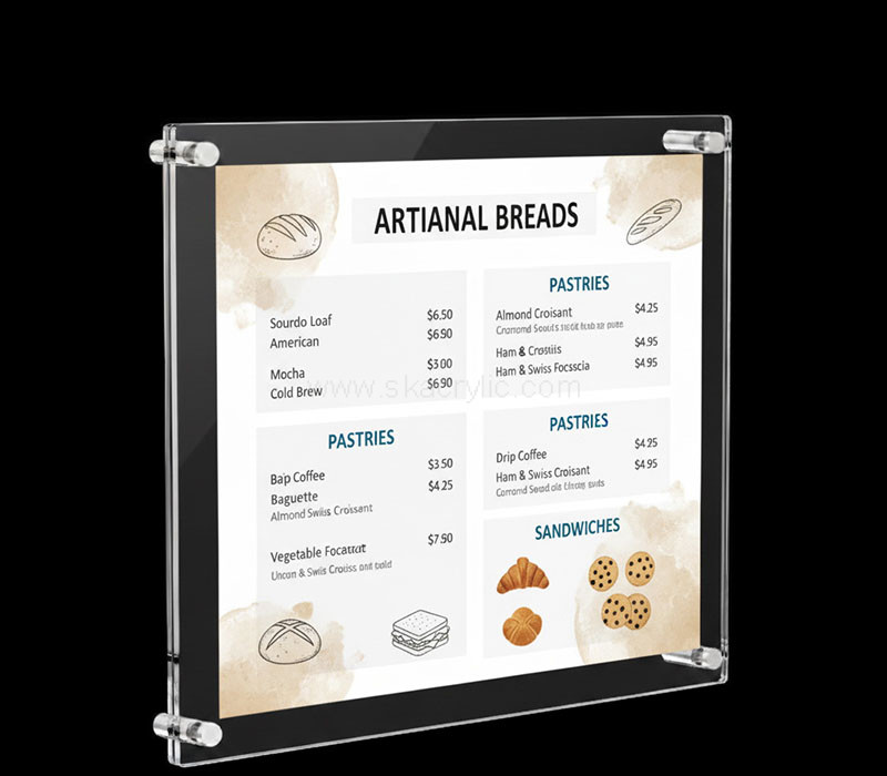 Custom acrylic wall bread shop menu holder, designed for displaying menus, price lists, or daily specials with a sleek and modern touch. Made from durable clear acrylic for long-lasting use and easy wall mounting. Perfect for bakeries, cafés, and restaurants. -We Cover All Import Fees for the US, UK, EU & Asia.