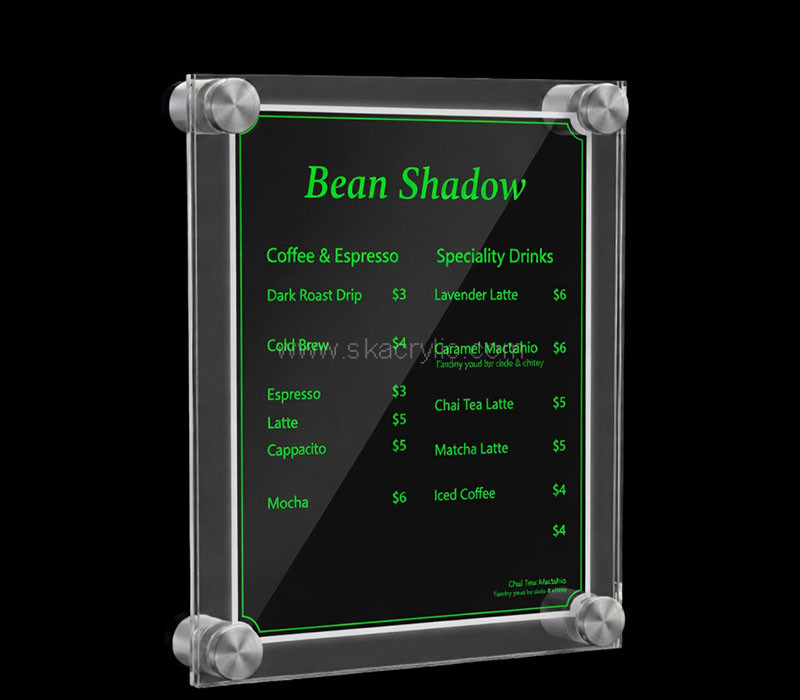 Custom acrylic wall-mounted coffee shop sign holder. Sturdy, clear display for menus and promotions. Colors, shapes and sizes fully customizable. Easy installation, durable design. Wholesale only, ideal for cafes and retail stores.