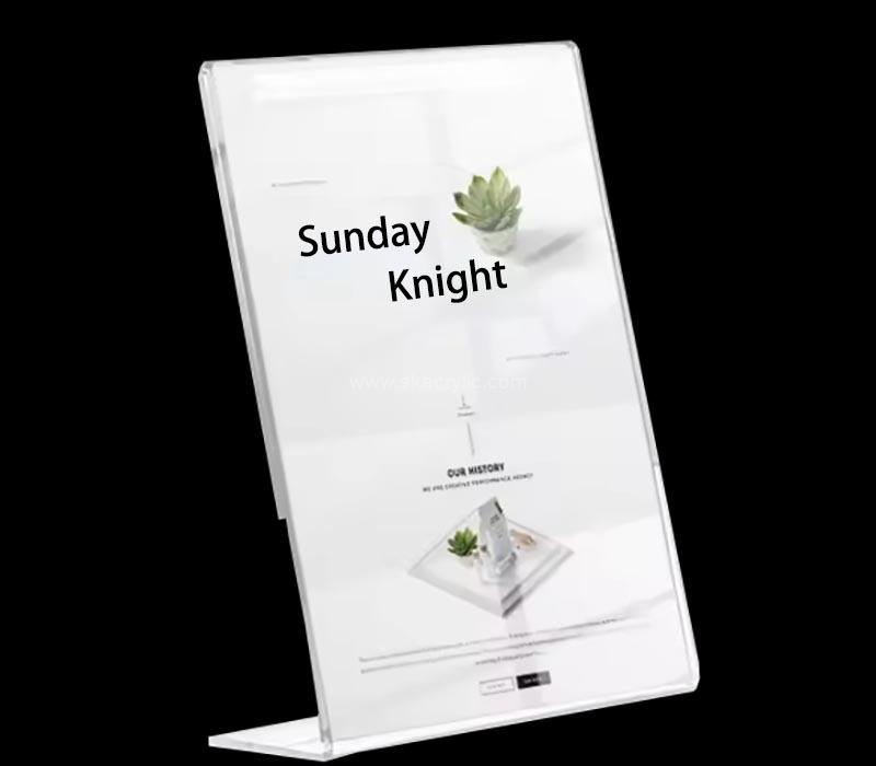 Wholesale custom L-shaped acrylic sign holders, perfect for displaying signs and promotions. Durable, clear acrylic with a modern design, these stands are ideal for retail, offices, and events.