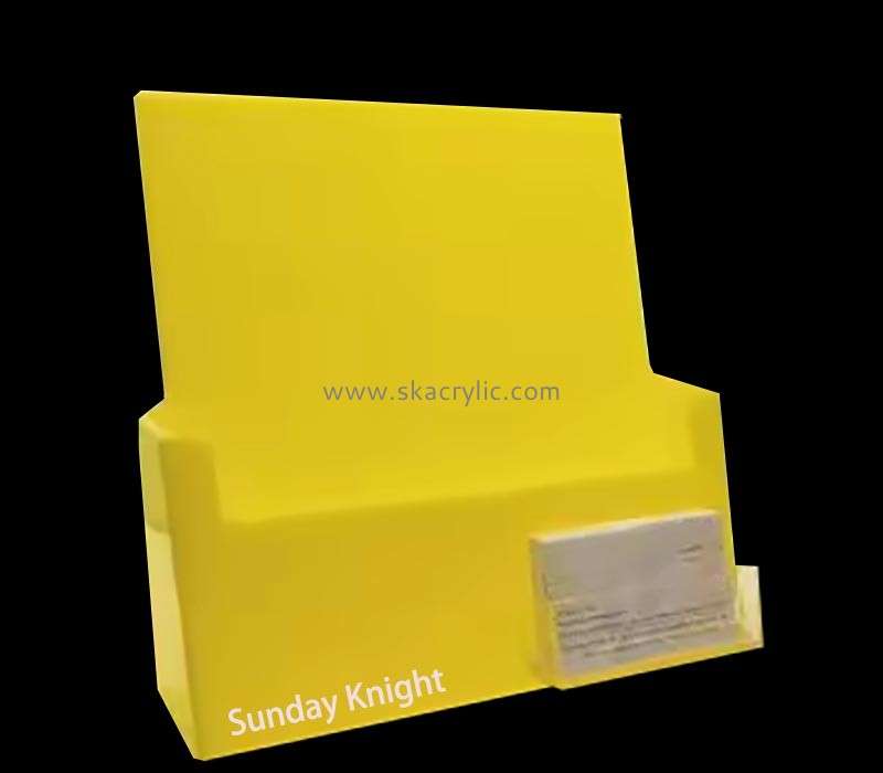 Brighten up your space with our custom yellow acrylic literature holders, featuring a clear business card slot. These stands are perfect for showcasing brochures and contact cards, adding a pop of color and organization to any office or reception area. Available for wholesale.